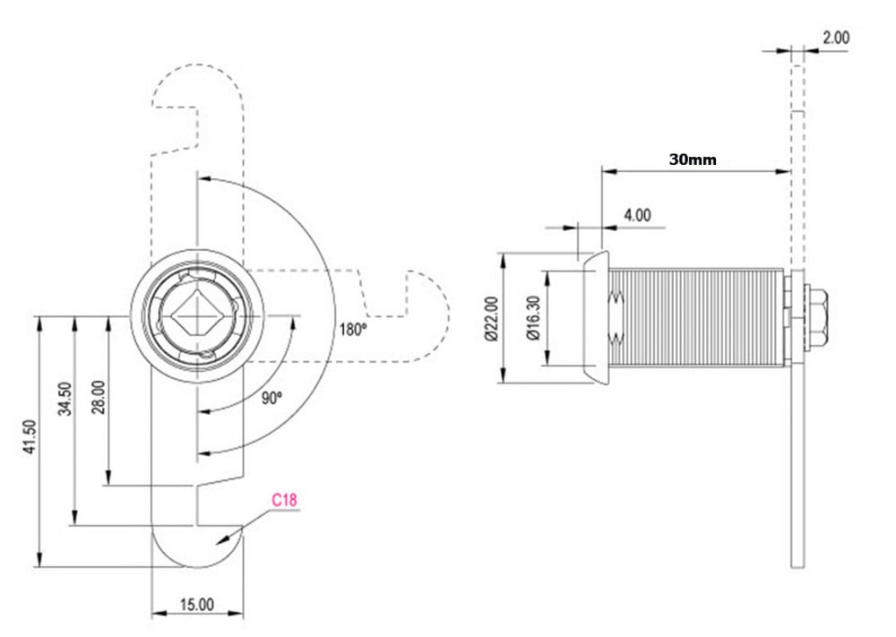 قفل اثاث خشب لسان مفتوح لون ذهبي مفتاح مخرم طول القلب 30 ملي