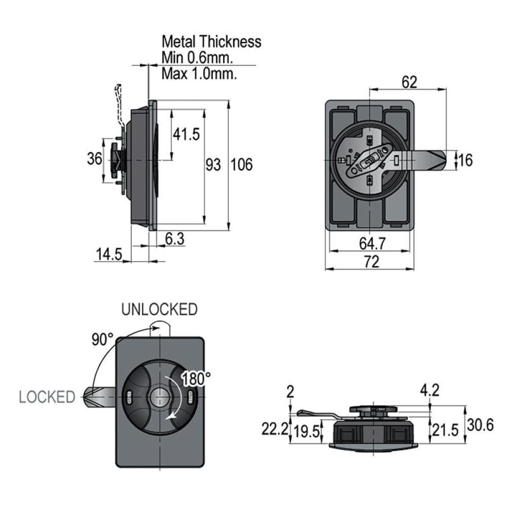 قفل خزانة حديديستخدم على فتحة مقاس 65.5 * 93.50 مليمناسب لسماكة الحديد :0.6-0.9 ملي (بعد الطلاء)صنع في تايلند