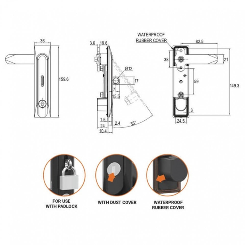 يُعد قفل باب بمقبض أسود مع قفل إضافي حلاً مثاليًا لتأمين الأبواب والخزائن الصناعية. يتميز بتصميم قوي ومتين مع إمكانية إضافة قفل خارجي لزيادة الأمان. يناسب الخزائن الكهربائية، لوحات التحكم، والأبواب المعدنية في البيئات الصناعية والتجارية.