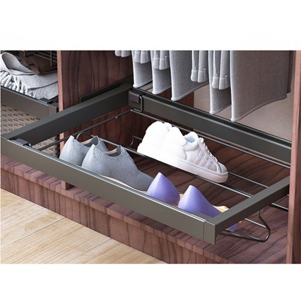 - رف سحب للأحذية بتصميم أنيق ولون موكا الراقي، مزود بسحاب هيدروليكي لتوفير حركة سلسة وسهلة. مثالي لتنظيم الأحذية داخل الخزائن بشكل عملي وأنيق.