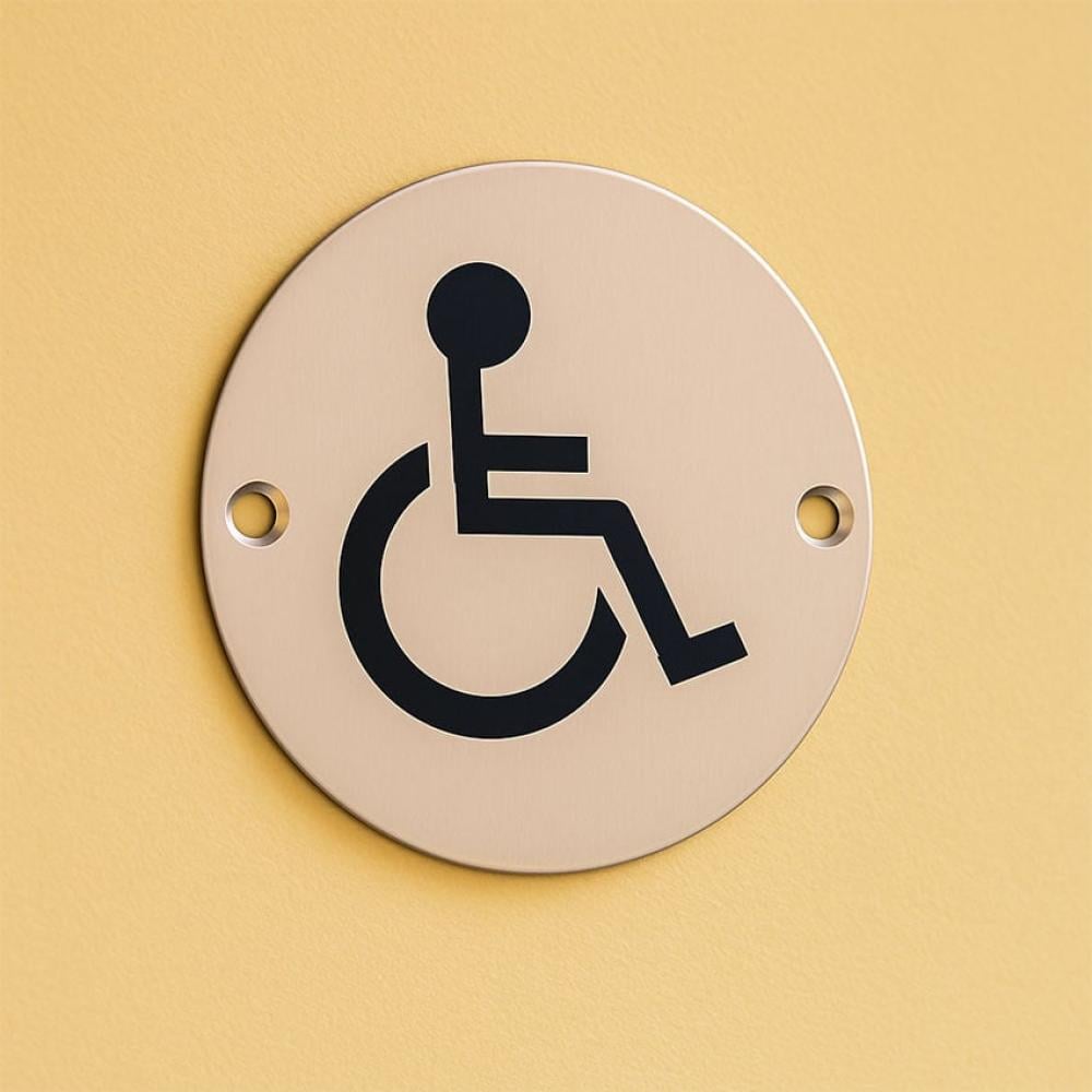 Show your commitment to inclusivity with this Accessible Facility Sign made from high-quality stainless steel. The round design features the internationally recognized wheelchair symbol, offering clarity and professionalism in any setting.