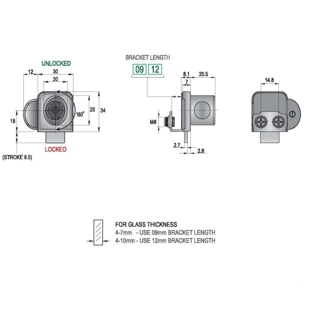 Double glass door cabinet lockFor Glass Thickness:4-7mm - use 9mm cylinder housing length4-10mm - use 12mm cylinder housing lengthMade in Thailand