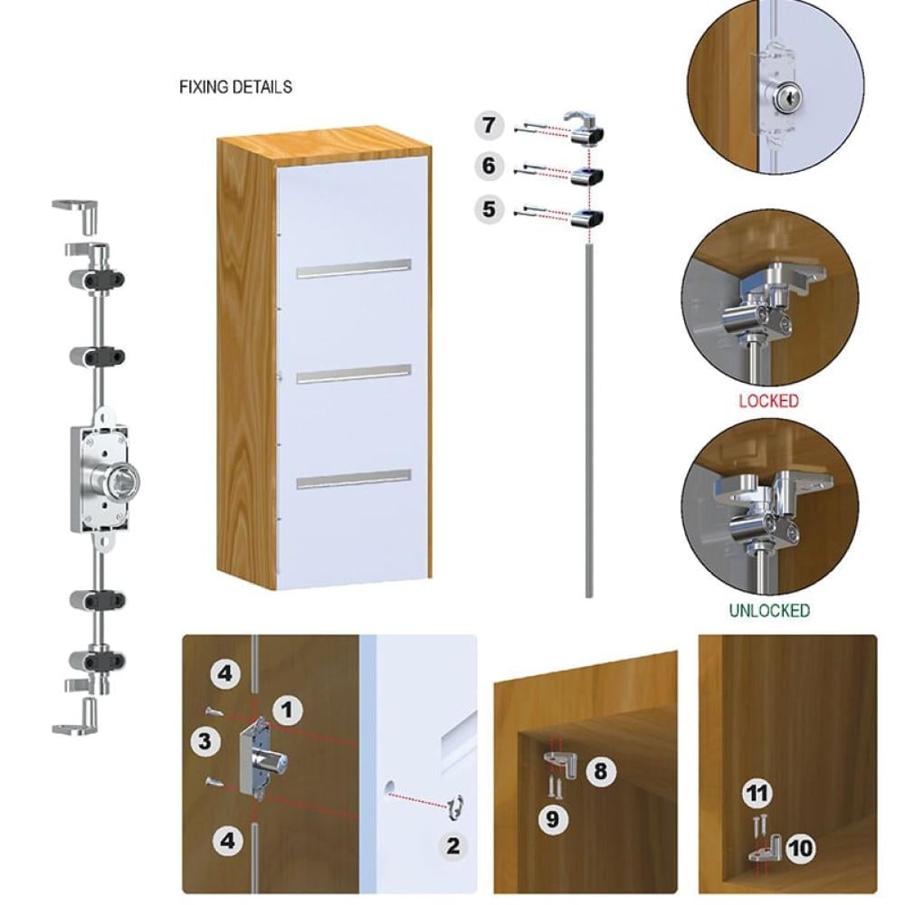 The Espagnolette Lock is a reliable multi-point locking system designed to secure wooden and metal cabinets, doors, and storage units. With its robust design and smooth operation, it ensures enhanced security and even force distribution across multiple locking points, making it ideal for residential, office, and industrial applications.