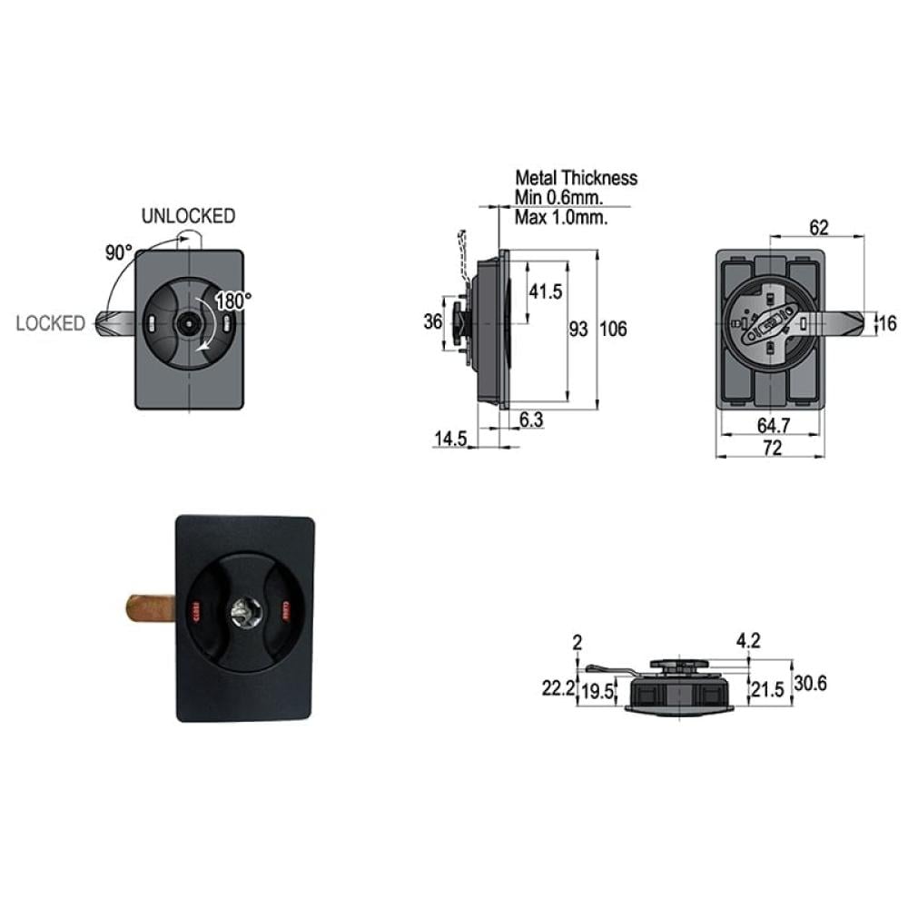 A square, flush-mounted face blends seamlessly with the door surface, ideal for metal cabinets and office furniture.