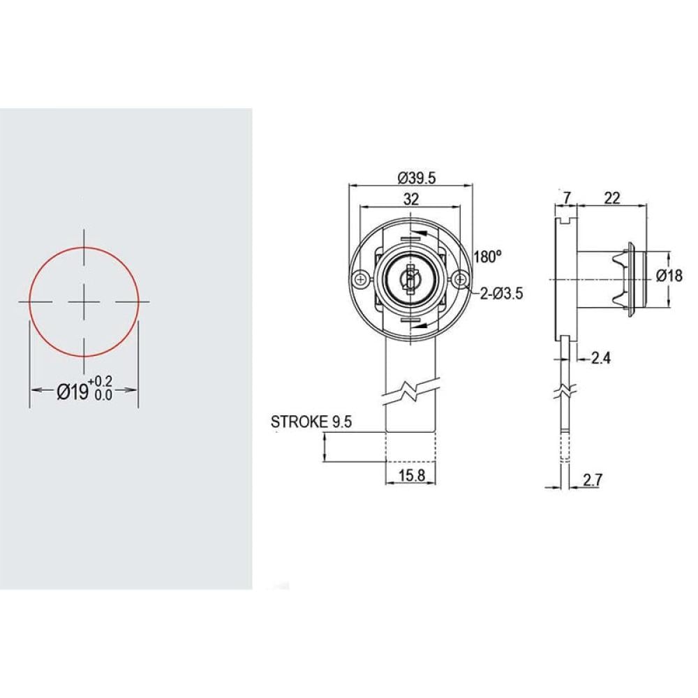 Side Central Lock 22mmFixing Hole Size :Ø20mm For Ø19mm cylinder housing diameterFor Wood Thickness:16-20mm - use 22mm cylinder housing lengthMade in Thailand