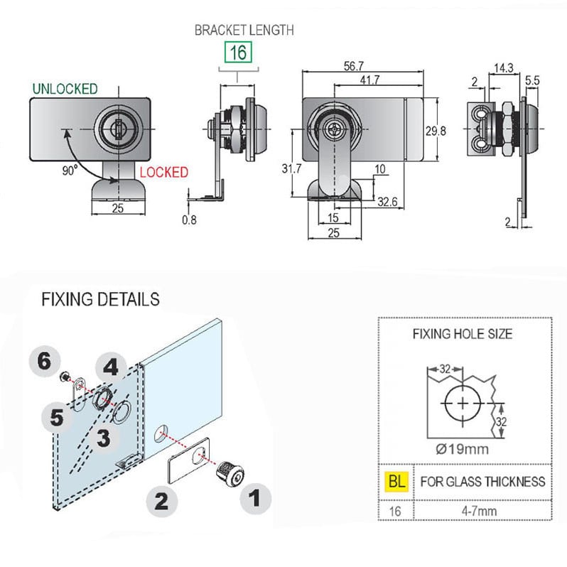 Double glass door cabinet lock Fixing Hole Size :Ø19 mm For Glass Thickness:4-7mm - use 16mm cylinder housing lengthMade in Thailand